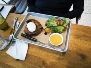לצד זה הגיעו קנל גבינת שמנת, טחינה, זיתי קלמטה, ירקות חתוכים ולחמים. בחרתי בפוקאצ'ה, והיא הייתה מצוינת. כמעט לוהטת, מהבילה עם אדים שעולים ממנה כמו סוד קטן. מריחה של חמאה עליה הייתה רגע של סיפוק. החמאה נמסה ונעלמה כאילו תמיד הייתה שם. הפוקאצ'ה היתה רכה מבפנים עם קרום עדין מבחוץ. כשקורעים אותה ביד, היא נמתחת לרגע, ואז נכנעת. ריח של שמן זית ומלח גס עולה ממנה, כזה שגורם לך לשכוח לרגע כל אכזבה אחרת.