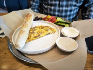 אני, באקט של פטריוטיות קולינרית, הלכתי על מנה בשם 'בוקר ישראלי' (63 ש'). שתי ביצים, כך הובטח לי, לפי בחירה. מה שהגיע היה פחות בחירה ויותר פרשנות חופשית. החביתה שביקשתי רכה, יצאה מהמטבח קשה כמו מישהו שעבר יום קשה: מקושקשת, צרובה, עם כתמי שיזוף שלא ביקשתי. היא היתה אכילה, כן, אבל גם תזכורת לכך שביצים הן עניין של רגש, לא רק של טכניקה.