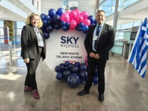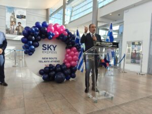 לצדו ניצבה שגרירת יוון בישראל, מאריה סולומו (Maria Solomou), שהעניקה גושפנקה דיפלומטית לאירוע. "אני גאה בכל חברה יוונית שמגיעה לפעול בישראל, במיוחד בתקופה רגישה זו", אמרה. "ישראל ויוון נהנות מקשרי תיירות מצוינים, והקו החדש של SKY express יחזק אותם עוד יותר. זהו גשר נוסף בין המדינות. גשר של חברות, תרבות ותנועה".