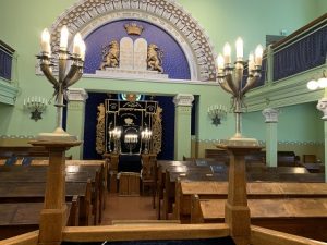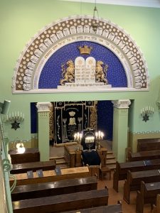 אזור ארון הקודש ומעליו נצבעו בצבע כחול כהה, והעיטורים שמעליו שוחזרו בגוונים האורגינליים.