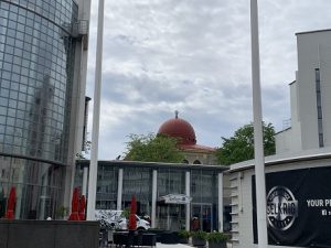 באופן טבעי, קבוצות מטיילים דתיות מעדיפות לשהות בשבתות במלון רדיסון בגלל קרבתו לבית הכנסת ולמסעדה הכשרה בבנין הקהילה היהודית. כדי להגיע לבית הכנסת אנחנו חוצים את הלובי של מלון. קל לזהות את בית הכנסת לא רק בזכות את הכיפה האדומה שעל גגו, אלא בעיקר בגלל מצלמות האבטחה שמוצבות על גדר האבן ועל כל עמודי החשמל בסביבתו. בכניסה יש עמדת שמירה ממוגנת, ובתוכה מאבטחים ישראלים שבודקים את הדרכונים של המבקשים להיכנס.
