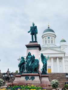הכיכר מוקפת מצדדיה בבניינים גדולים ומרשימים, שכולם עוצבו בידי אותו ארכיטקט. הבנין הלבן מולנו הוא הקתדרלה העתיקה. הבנין הצהוב משמאלנו הוא בית הפרלמנט. נשים לב שבכל קומה יש חלונות בסגנון עיצוב שונה. בשנות ה80 כיהן בפרלמנט גם יהודי ששמו בן זיסקוביץ'. בפרלמנט של פינלד יש 200 מושבים. 40% מחברי הפרלמנט הן נשים. גם חצי מהממשלה הפינית. נשים בקבוצה שלנו אמרו "הלוואי עלינו".
