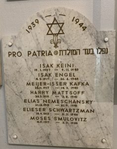 הבנין הצהוב הישן יותר שמימיננו הוא בית הכנסת. לפני שנכנסים אליו אנו רואים על הקיר מצבת אבן שחורה לזכר קורבנות השואה. כאמור לעיל, יהודי פינלנד לא הושמדו בשואה.