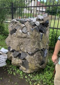 כאשר פרקו את האנטנות, והטרקטורים הרסו את בסיסי הבטון שלהן, נחשפו הרבה עצמות אדם בשטח האנטנות. ראשי הקהילה אספו אותן, וקברו את העצמות בקבר אחים. על מקום הקבורה שמו מצבה גדולה זו: