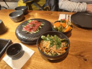 המתאבנים נפתחים בקימצ’י ביתי. "אנחנו מכינים אותו כאן", אומרת המנהלת גל צאיג, בחיוך קטן של מי שיודעת בדיוק מה הולך לקרות לך עוד רגע. לצידו מוגש סלט פפאיה ירוקה, ולידו סשימי טונה ברוטב פונזו.