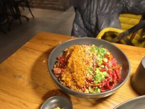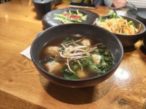 מרק דמפלינג עם בשר בקר, בתוך כיסונים רכים ומדויקים, ממולאים בבשר. כאלה שנפתחים בפה בלי מאבק. בכל ביס יוצא מתוכם מיץ מדהים לחלל הפה. הטמפרטורה מושלמת. לא לוהטת, לא קרה מדי, ולא מתנצלת. התיבול מספר סיפור שלם: ציפורן, ג’ינג’ר וכוכב אניס עולים מהקערה כמו ענן ריחני של סמטה אסיאתית אחרי גשם ראשון. יש שם חמימות, עומק, ומין מתיקות נסתרת שנשארת על החיך עוד רגע אחרי הבליעה. הכוסברה הטרייה סוגרת את הקשת. וואו קטן, אבל כזה שנשאר.