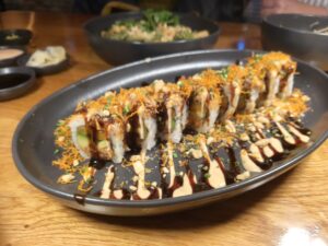 ואז מגיע הרגע שלשמו באמת התכנסנו כאן. רול הבית: ספיישל מיו. רול ספייסי עם סלמון קצוץ ומתובל, אבוקדו ובטטה, עטוף בסלמון צרוב, מיונז טמפורה, ומעל קריספי בטטה, פירורי בוטנים ועירית קצוצה. גל מספרת שזו המנה הפופולרית ביותר במסעדה. בצדק!
